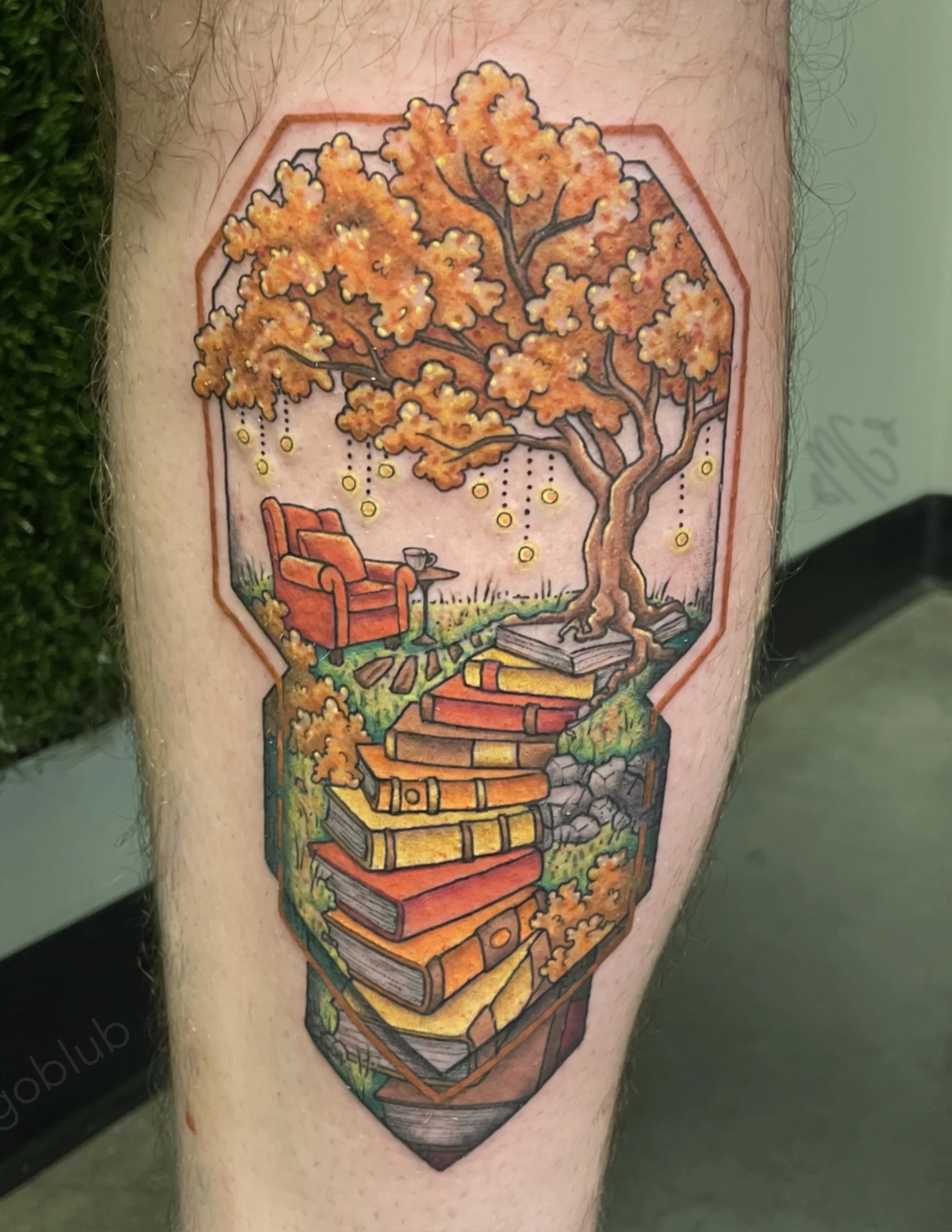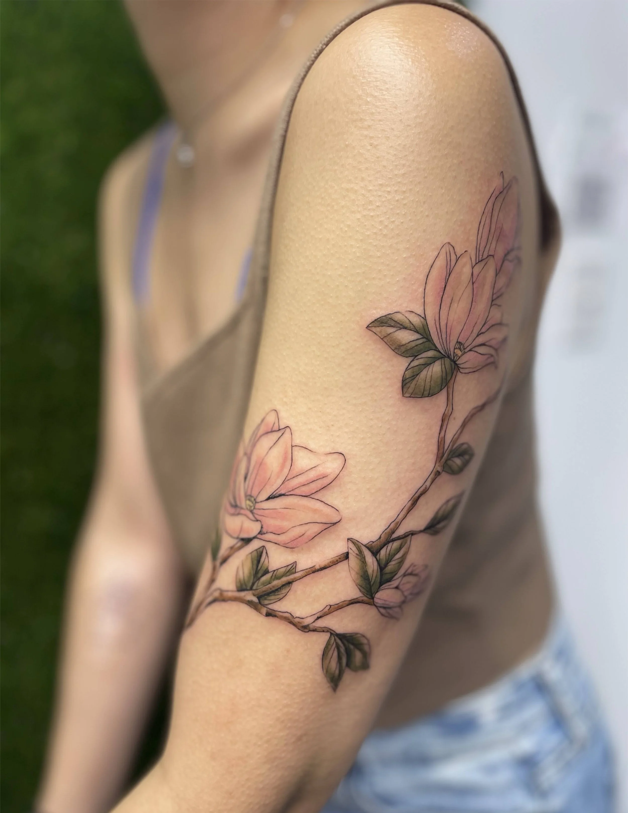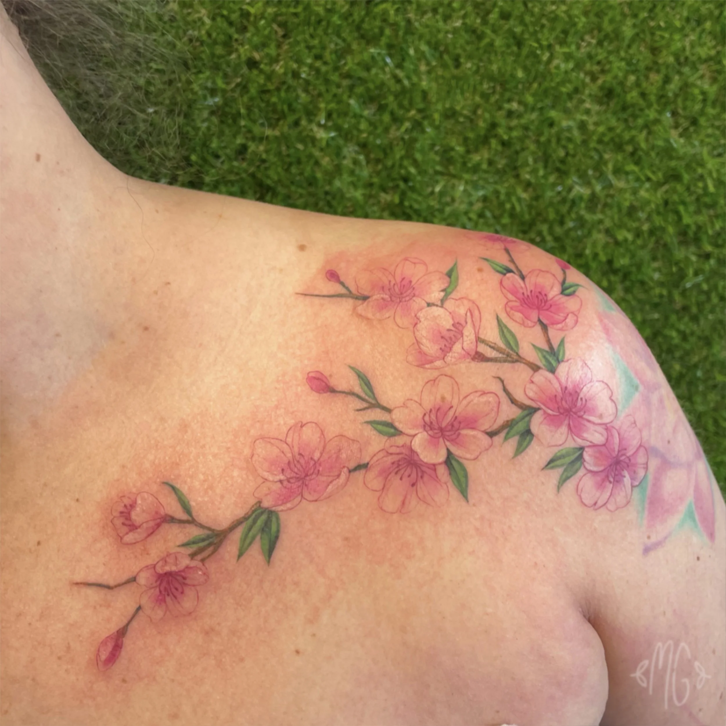 I love to work with fine-line, color, and small black-and-grey pieces. I enjoy drawing in illustrative and semi-realism styles that flow with the body and have a story to them. I take pleasure in working on feminine styles and subject matter.