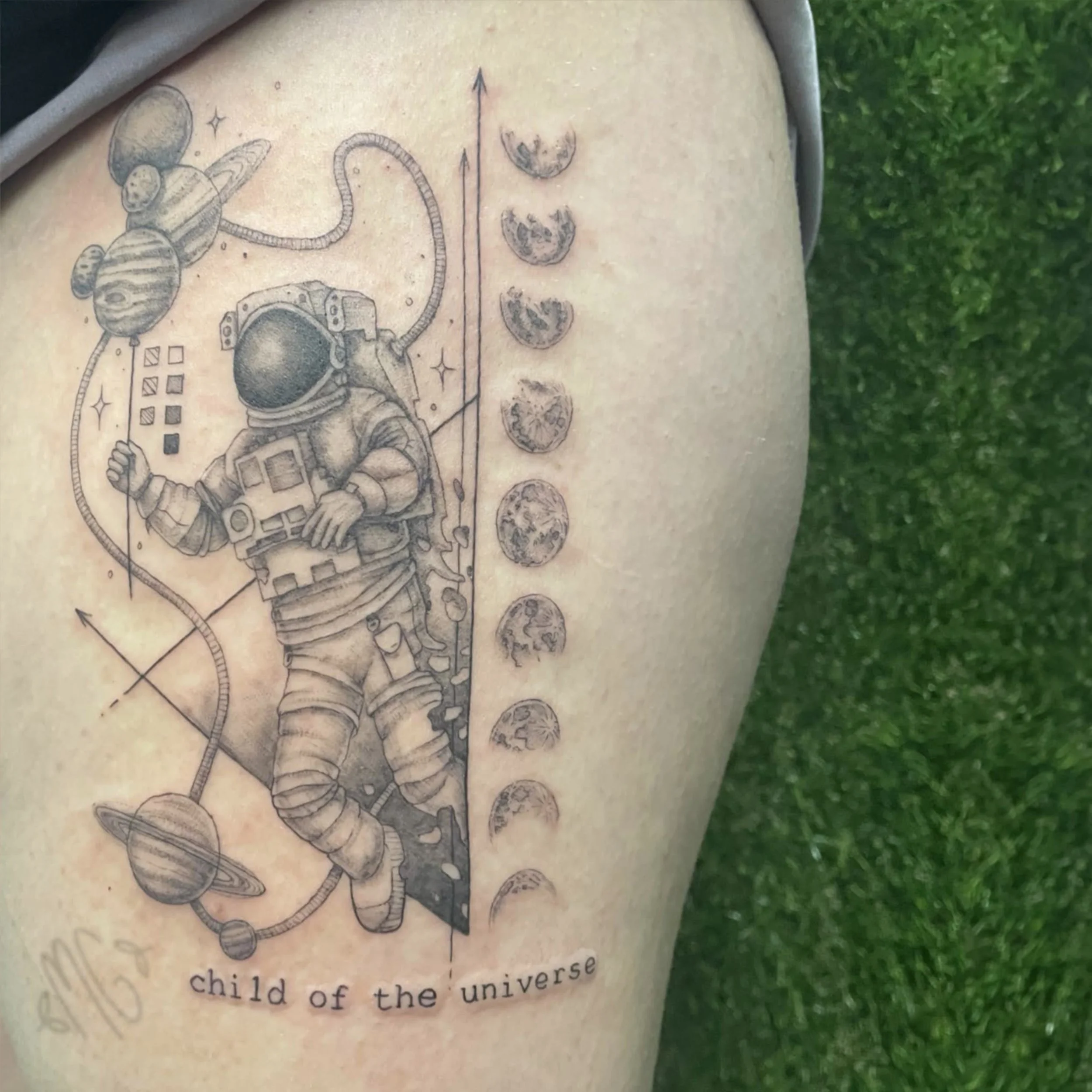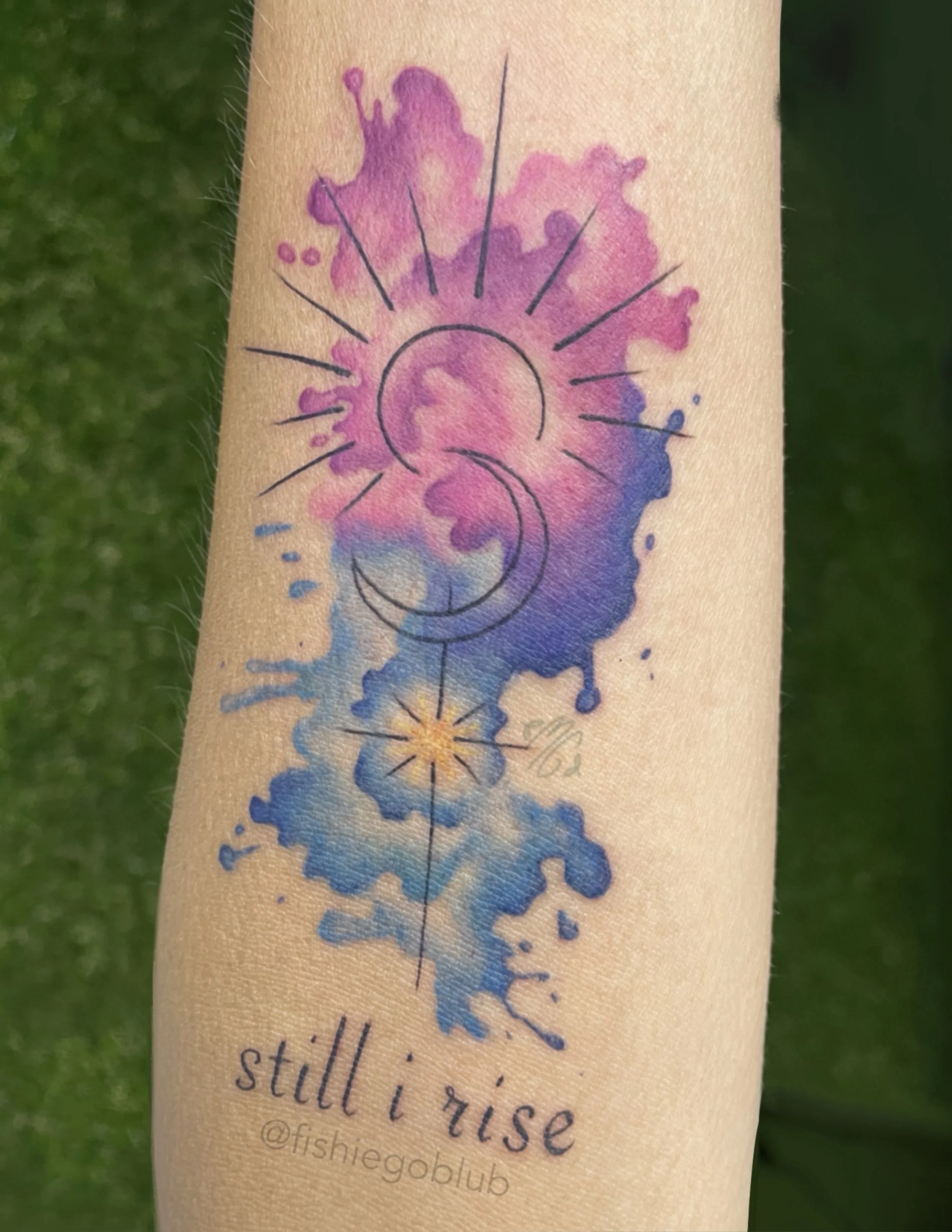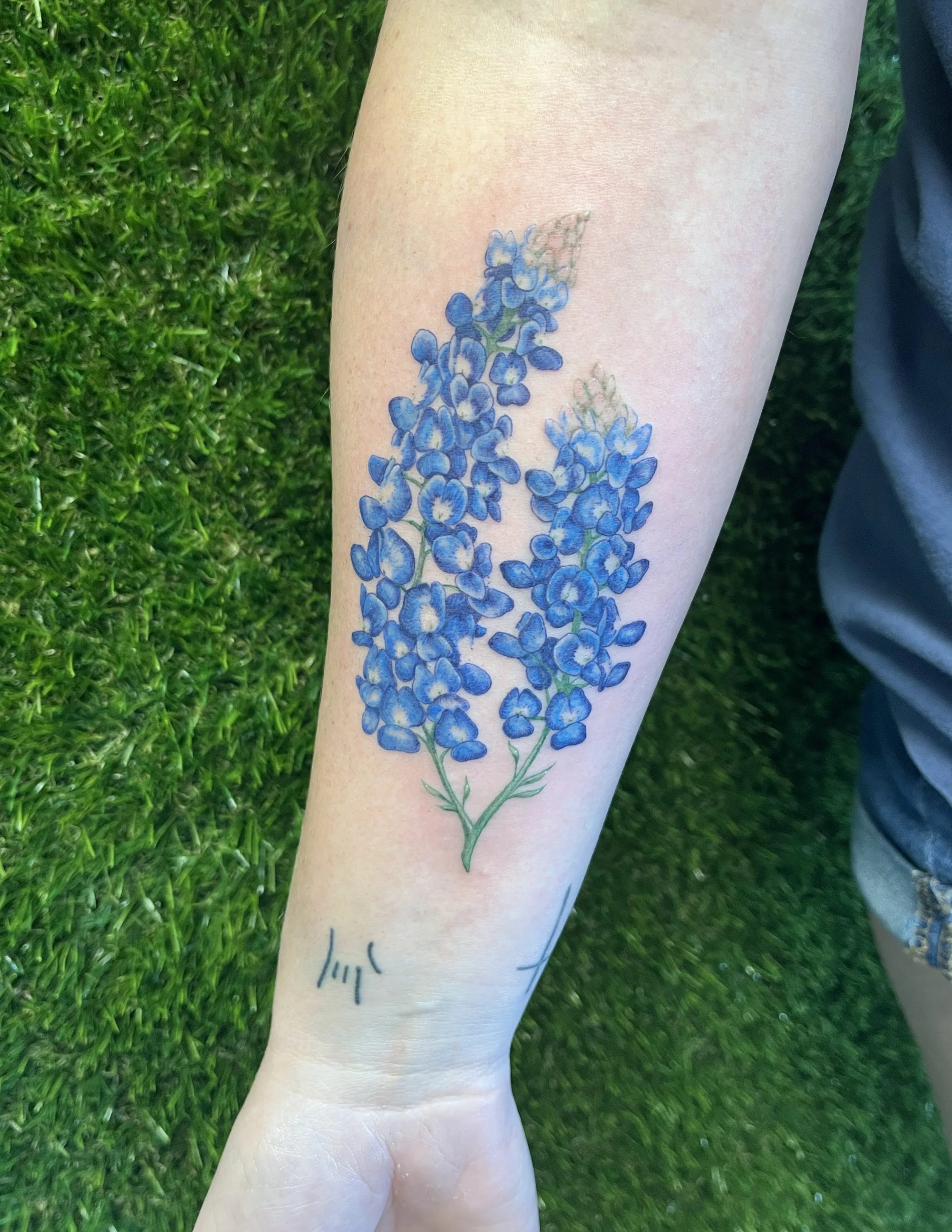 I love to work with fine-line, color, and small black-and-grey pieces. I enjoy drawing in illustrative and semi-realism styles that flow with the body and have a story to them. I take pleasure in working on feminine styles and subject matter.